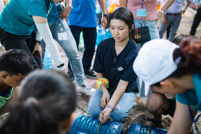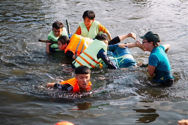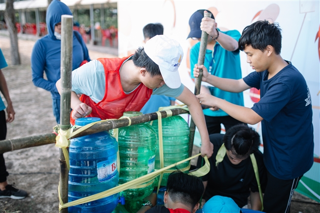 Các em rất háo hức với phần thử thách tự tay kết bè, từng thành viên được hướng dẫn từ việc cố định khung, lắp bình nước cho đến cách buộc các dây lại với nhau để làm sao cho bè chắc chắn và chịu đựng được sức nặng của người ngồi trên.