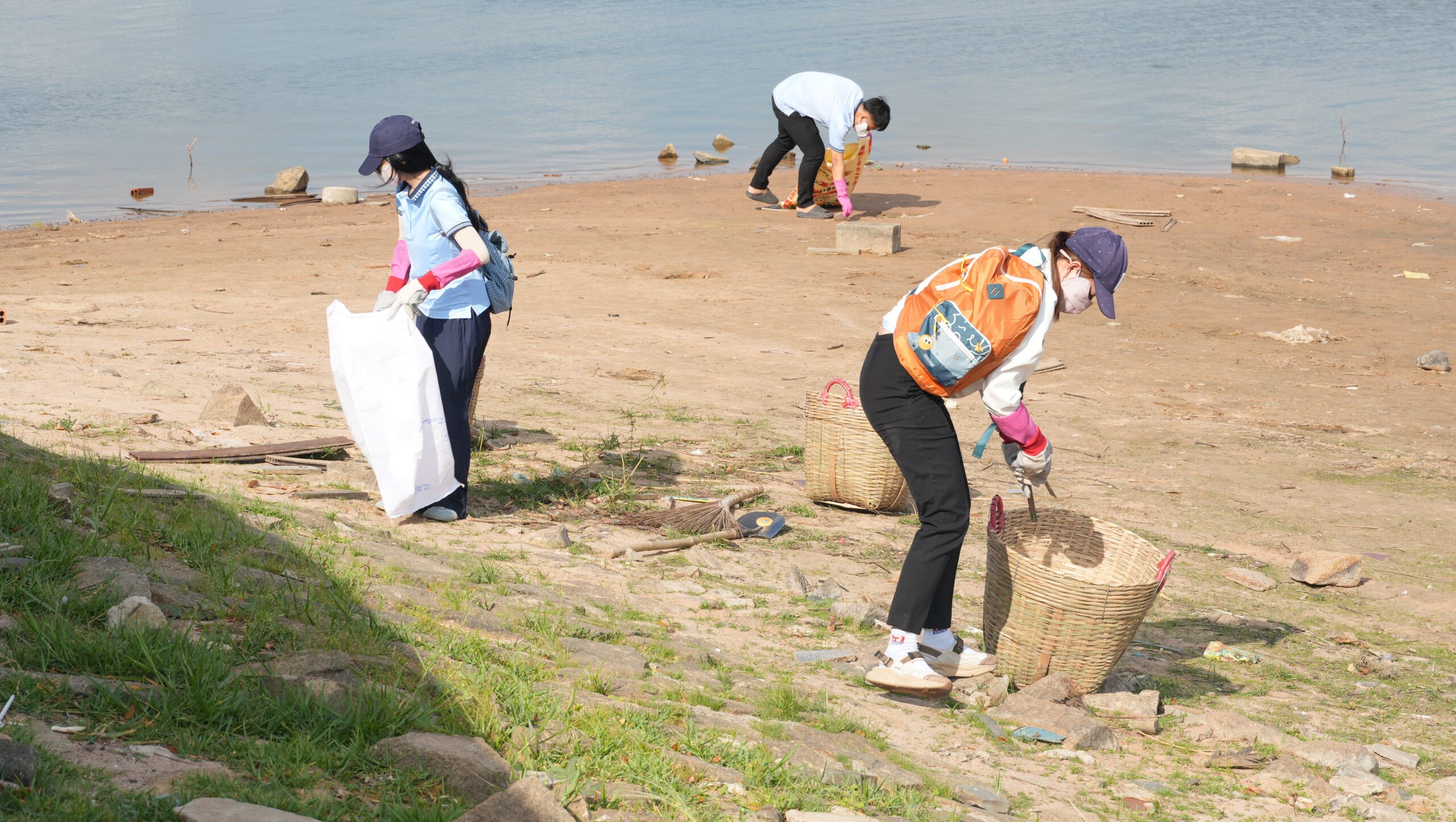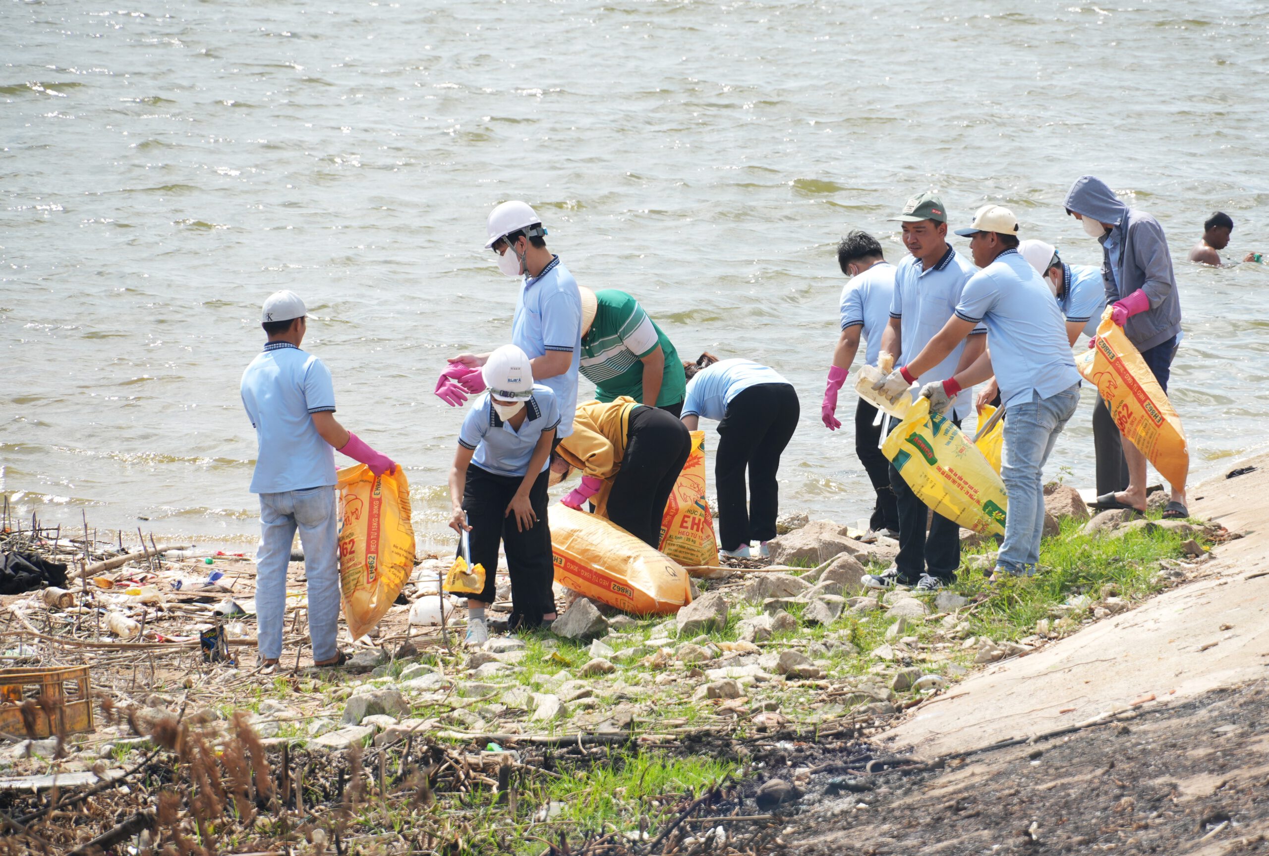 Các đoàn viên tích cực thu gom rác thải, làm sạch khu vực ven hồ Xuyên Mộc