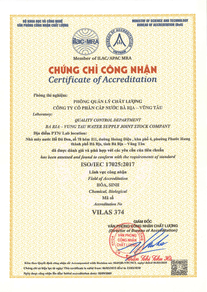 Bên cạnh đầu tư xây dựng, cải tạo các nhà máy xử lý nước, thường xuyên duy tu, sửa chữa và thay thế các thiết bị, máy móc phục vụ sản xuất; Công ty CP cấp nước BR-VT (BWACO) còn chú trọng đầu tư cho công tác quản lý chất lượng nước để luôn đảm bảo cấp nước đạt “Quy chuẩn kỹ thuật quốc gia về chất lượng nước sạch sử dụng cho mục đích sinh hoạt” ban hành kèm theo QCVN 01 – 1: 2018/BYT của Bộ Y tế và “Quy chuẩn kỹ thuật địa phương về chất lượng nước sạch cho mục đích sinh hoạt trên địa bàn tỉnh BR-VT” ban hành kèm theo QCĐP 01:2022/ BR-VT
