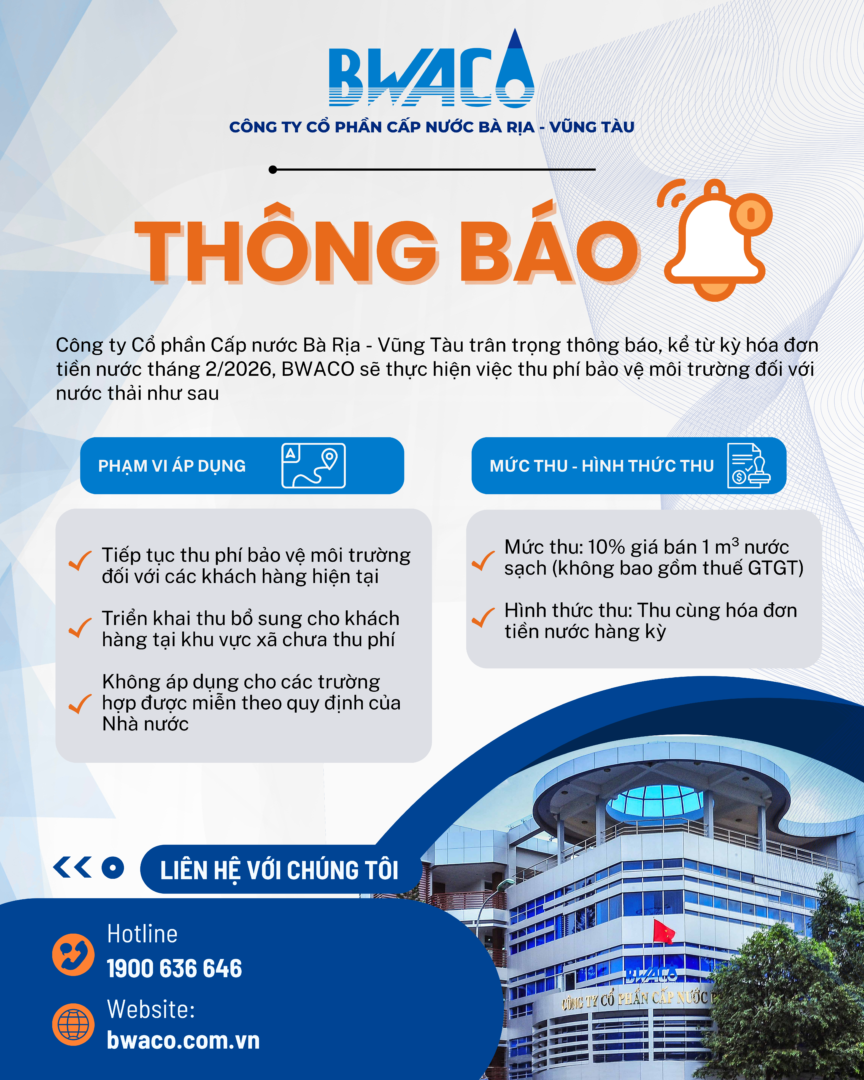 BWACO THÔNG BÁO THU PHÍ BẢO VỆ MÔI TRƯỜNG ĐỐI VỚI NƯỚC THẢI